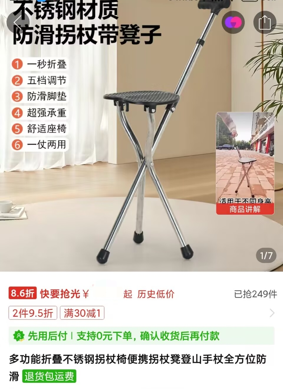 我还有一个非常喜欢的出门神器 ------ 拐杖椅(相关图片会贴在下面)。它能在我走路的时候给我有力的支撑,我可以用它撑着地面,缓解走路时脚落地的震动带给身体的疼痛。而且走累了的时候,我可以把它放下来当椅子用,随时随地休息,特别方便。
